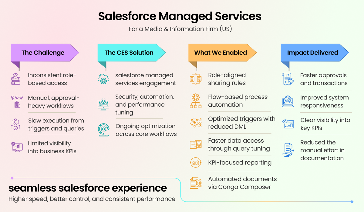 These challenges reflected the typical pain points enterprises face when Salesforce has been implemented but not continuously optimized.